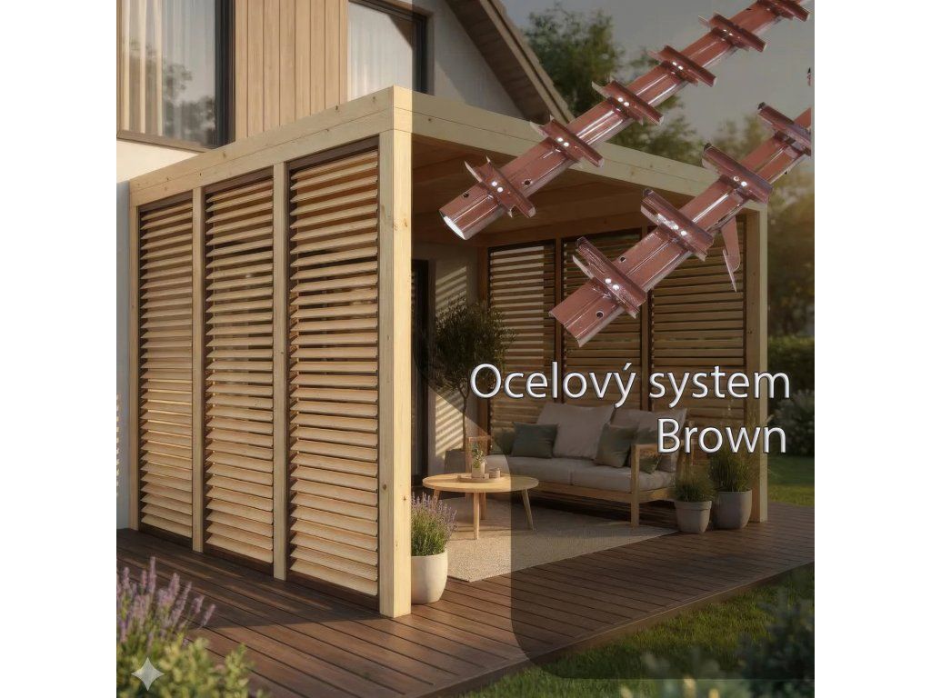 Lamely o rozměrech 19 mm x 95 mm (maximální délka 120 cm) jsou frézované tak, aby v uzavřeném stavu vytvořily dokonale hladký povrch. K ocelovému systému lze pořídit surová borovicová prkna, která přirozenou kresbou dřeva zjemňují industriální charakter kovu a dodávají celé konstrukci teplejší atmosféru. Kombinace oceli a přírodního dřeva vytváří vizuálně silný kontrast, který funguje v moderních i tradičních venkovních prostorech.